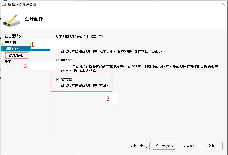 - 1.先「選擇動作」,2.再按「擴充」,最後選擇「設定磁碟」!